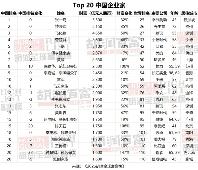 仅次于纽约的146位,榜单显示,3月5日,字节跳动创始人张一鸣以5500亿元人平易近币财富成为中国首富,此中,农夫山泉的钟睒睒(5150亿元)和腾讯的马化腾(4650亿元)排列二、三位。